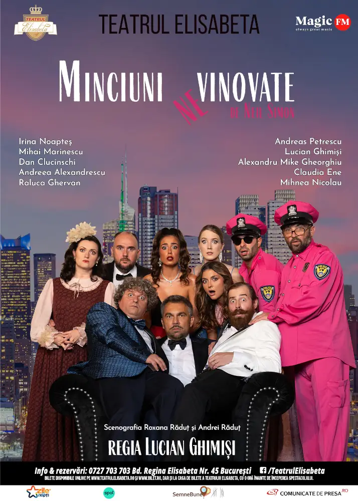 Așa începe spectacolul “Minciuni nevinovate”, noua producție a Teatrului Elisabeta, în regia lui Lucian Ghimiși. Comedia, semnată de multipremiatul dramaturg Neil Simon, aduce în atenția spectatorului tipologii clasice de cupluri și felul în care acestea reacționează în situații-limită.
