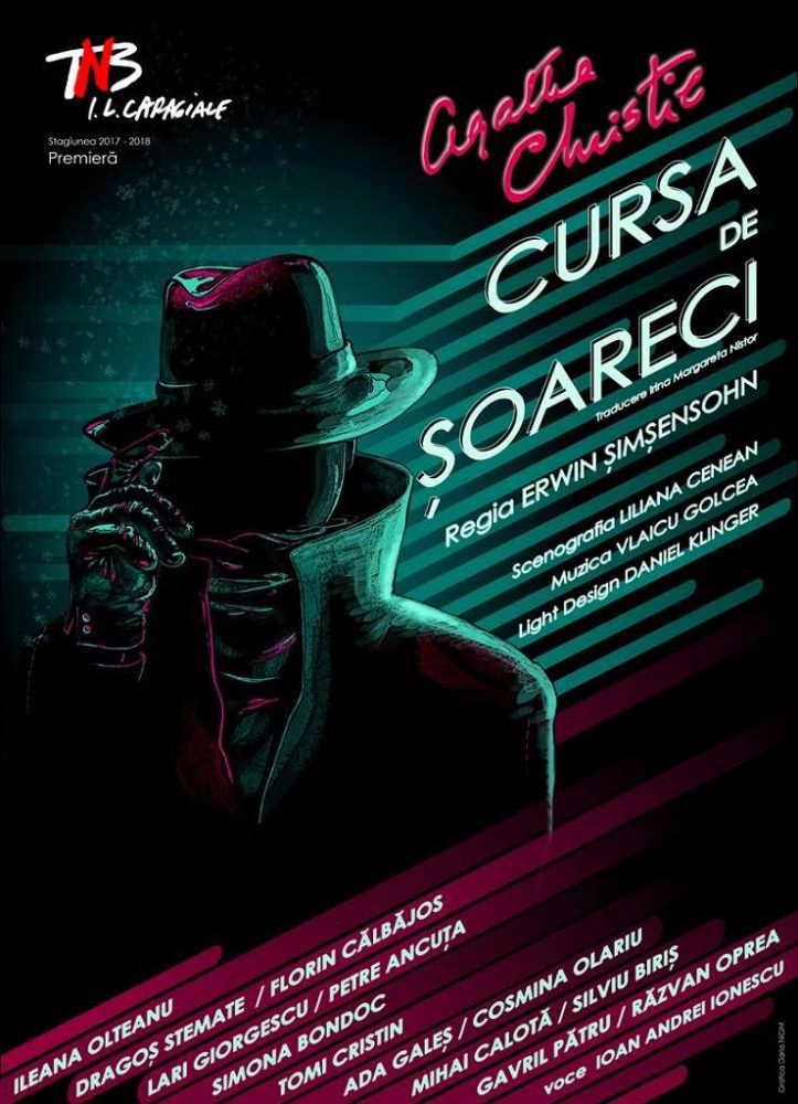 Cursa de soareci se va juca la Teatrul National din Bucuresti luna aceasta. Avanpremiera spectatcolului s-a jucat pe 8 si 9 februarie, iar premiera oficiala este programata pe 15 si 16 februarie 2018, de la ora 19:00, la Sala Studio. Piesa este scrisa de Agatha Christie, dupa un caz real petrecut in 1945, cand un baiat a murit in conditii misterioase dupa ce fusese adoptat de o familie de fermieri din Shropshire, Marea Britanie.