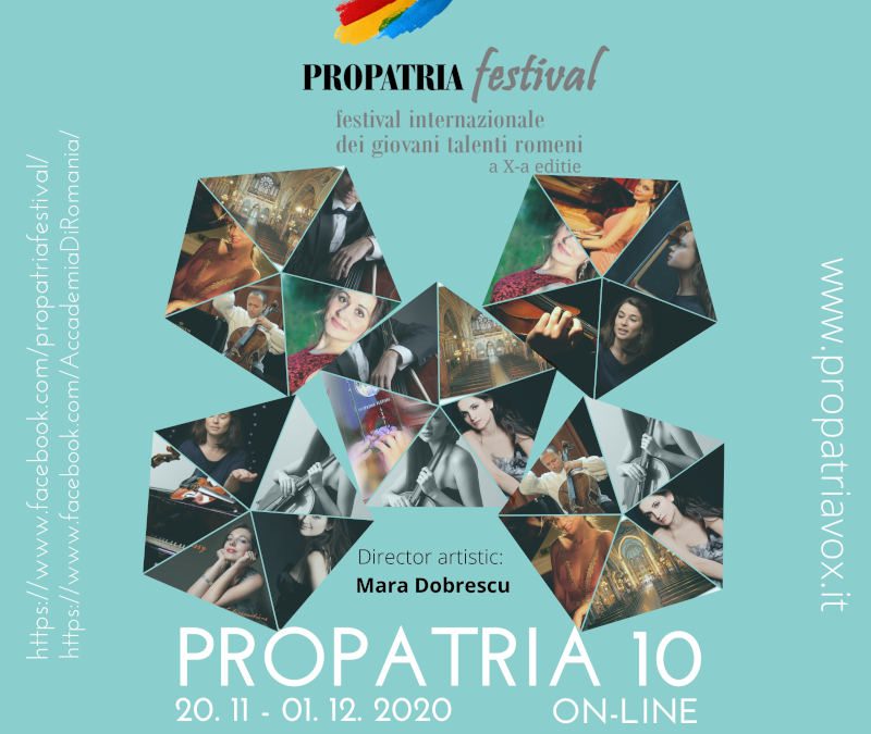 Începând cu data de 20 noiembrie, Festivalul Internaţional Propatria – Tinere talente românești, prin a zecea sa ediţie se deschide publicului de pretutindeni, propunând prima versiune online din istoria sa, cu sprijinul SGG-DRP. Ediţia X-a, aniversară, îşi propune să facă o retrospectivă a festivalului de la începuturile sale până astăzi, să readucă în memoria colectivă, din țară și din diaspora, talentul și implicarea artiștilor români din afara granițelor țării în menținerea vie a culturii românești peste hotarele țării și rolul lor de ambasadori culturali și de imagine ai României. Evenimentele vor fi transmise on line pe: