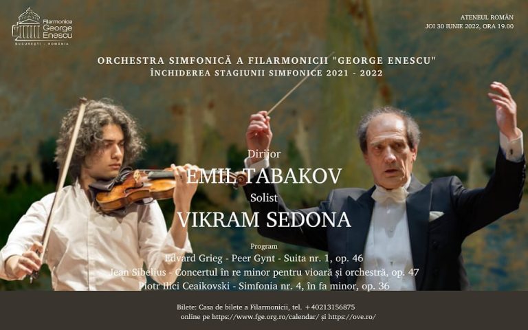 Joi, 30 iunie , Orchestra simfonică a Filarmonicii „George Enescu”, condusă de dirijorul bulgar Emil Tabakov, prezintă publicului concertul de închidere a stagiunii simfonice 2021-2022. Programul este alcătuit din lucrările: Peer Gynt – Suita nr. 1, op. 46 de Edvard Grieg, Concertul în re minor pentru vioară și orchestră, op. 47 de Jean Sibelius, cu violonistul italian Vikram Sedona în ipostază solistică, și Simfonia nr. 4, în fa minor, op. 36 de Piotr Ilici Ceaikovski.