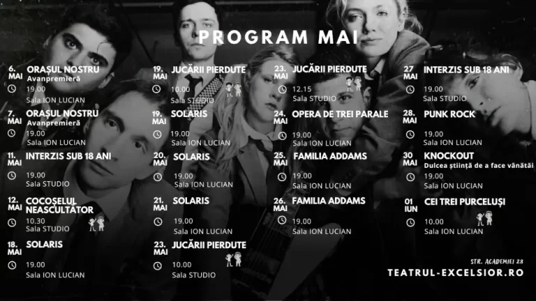 • Duminică 7 mai, ora 19:00, Teatrul EXCELSIOR, Sala „Ion Lucian”: Orașul nostru de Thornton Wilder, regia Alexandru Dabija – avanpremieră