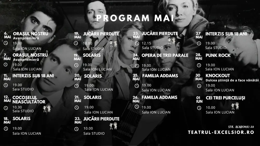 • Joi, 25 mai, ora 19:00, Teatrul EXCELSIOR, Sala „Ion Lucian”: Familia Addams – spectacol de musical – regia, coregrafia și costumele: Răzvan Mazilu