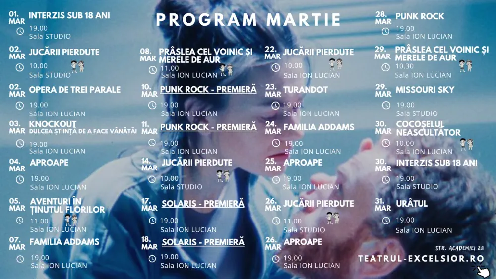 • Vineri, 24 martie, ora 19:00, Teatrul EXCELSIOR, Sala „Ion Lucian”: Familia Addams spectacol de musical – muzica: Andrew Lippa, libretul: Marshall Brickman și Rick Elice, regia, coregrafia și costumele: Răzvan Mazilu
