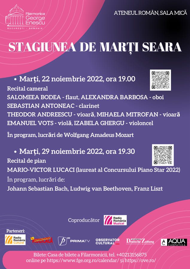În ultimul concert din această lună, în 29 noiembrie, la ora 19.30, tot în Sala mică a Ateneului Român, Stagiunea de marți seara propune o întâlnire cu pianistul MARIO-VICTOR LUCACI – Laureat al Concursului „Piano Star” 2022 – cu un program ambițios, ce alătură lucrări semnate Bach, Beethoven și Liszt. La cei 16 ani ai săi, tânărul pianist se poate lăuda cu câteva premii internaționale importante, dintre care amintim, în anul 2022, Concorso Musicale Internazionale Mediterraneo 2022 – Premiul I Absolut și Elite Musicians Competition -Trofeul Categoriei la Royal Academy of Music London; în anul 2021, Concours International de Musique ”Rencontre a Versailles” (Premiul I), Great Masters International Piano Competition ”Vladimir Horowitz”- online (Premiul I) și International Online Competition ”Sergei Rachmaninoff”.